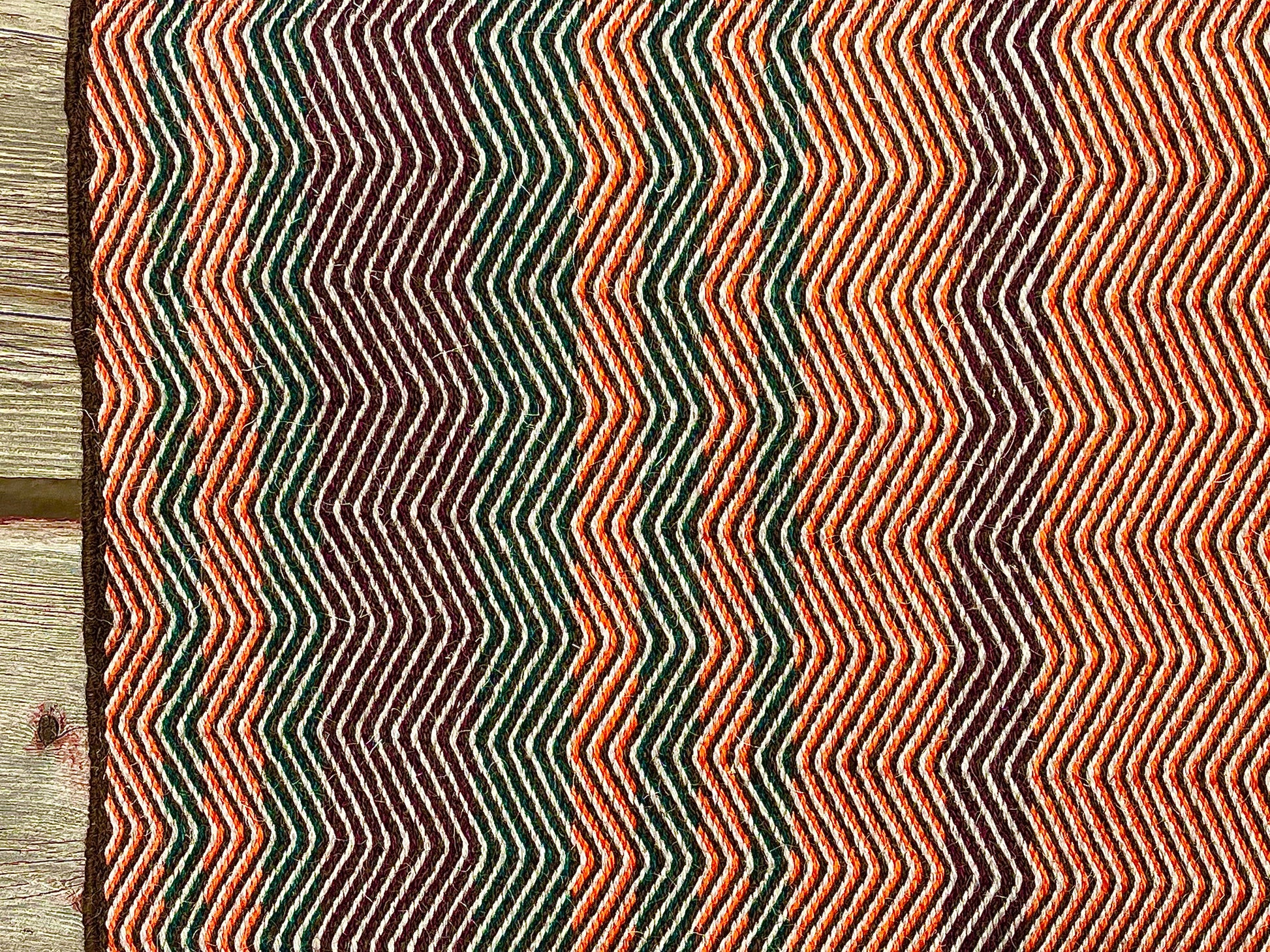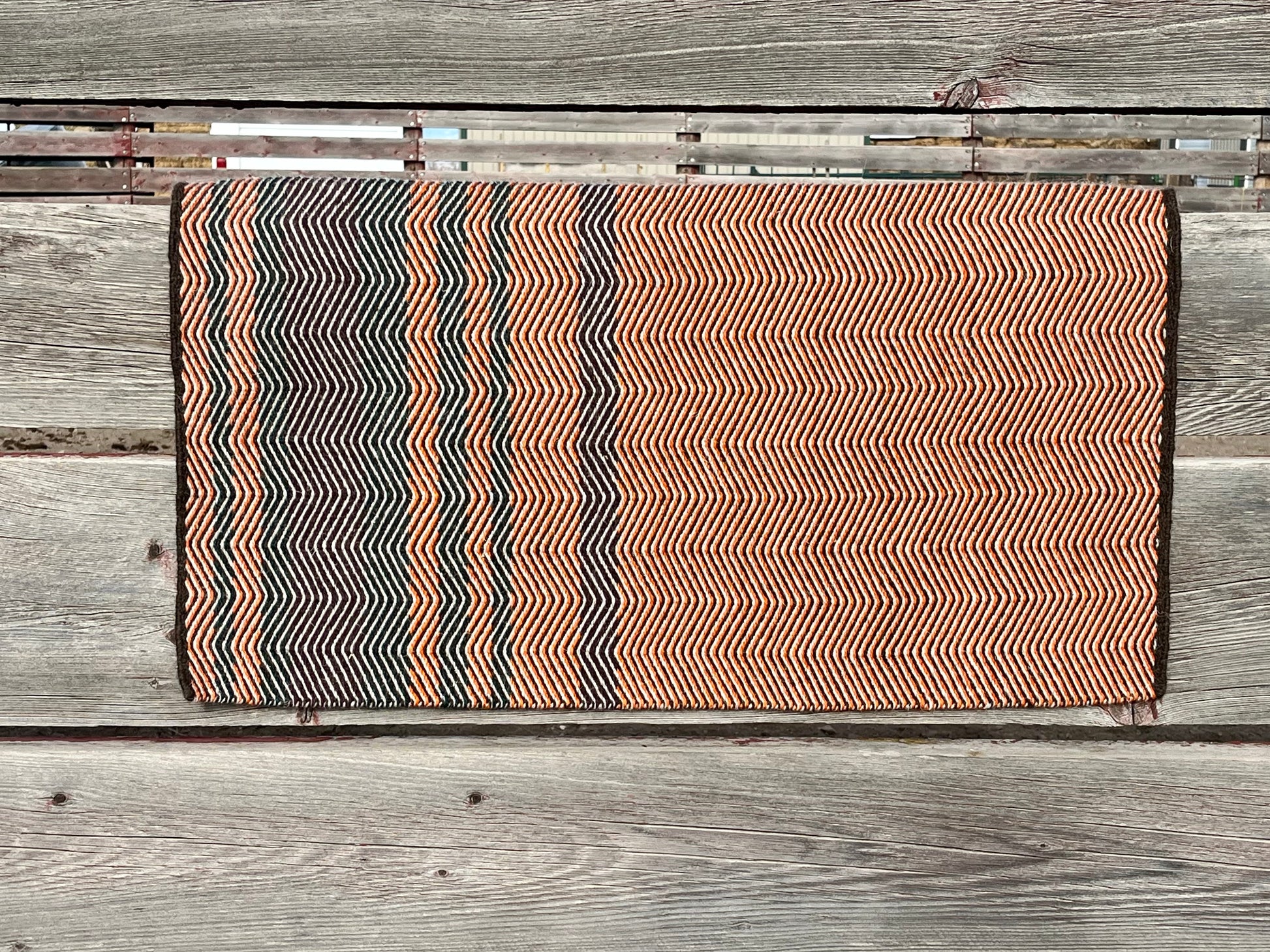 Hand-dyed orange, burgundy, and forest green with natural dark brown and light gray yarns. 100% Navajo Churro wool from Zwerneman Churro in Livingston, MT. 38"W x 34.5"L.